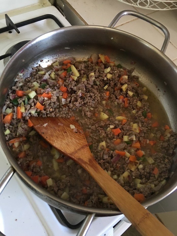3. Brown the vegetables, including potatoes, and ground beef with seasoning.