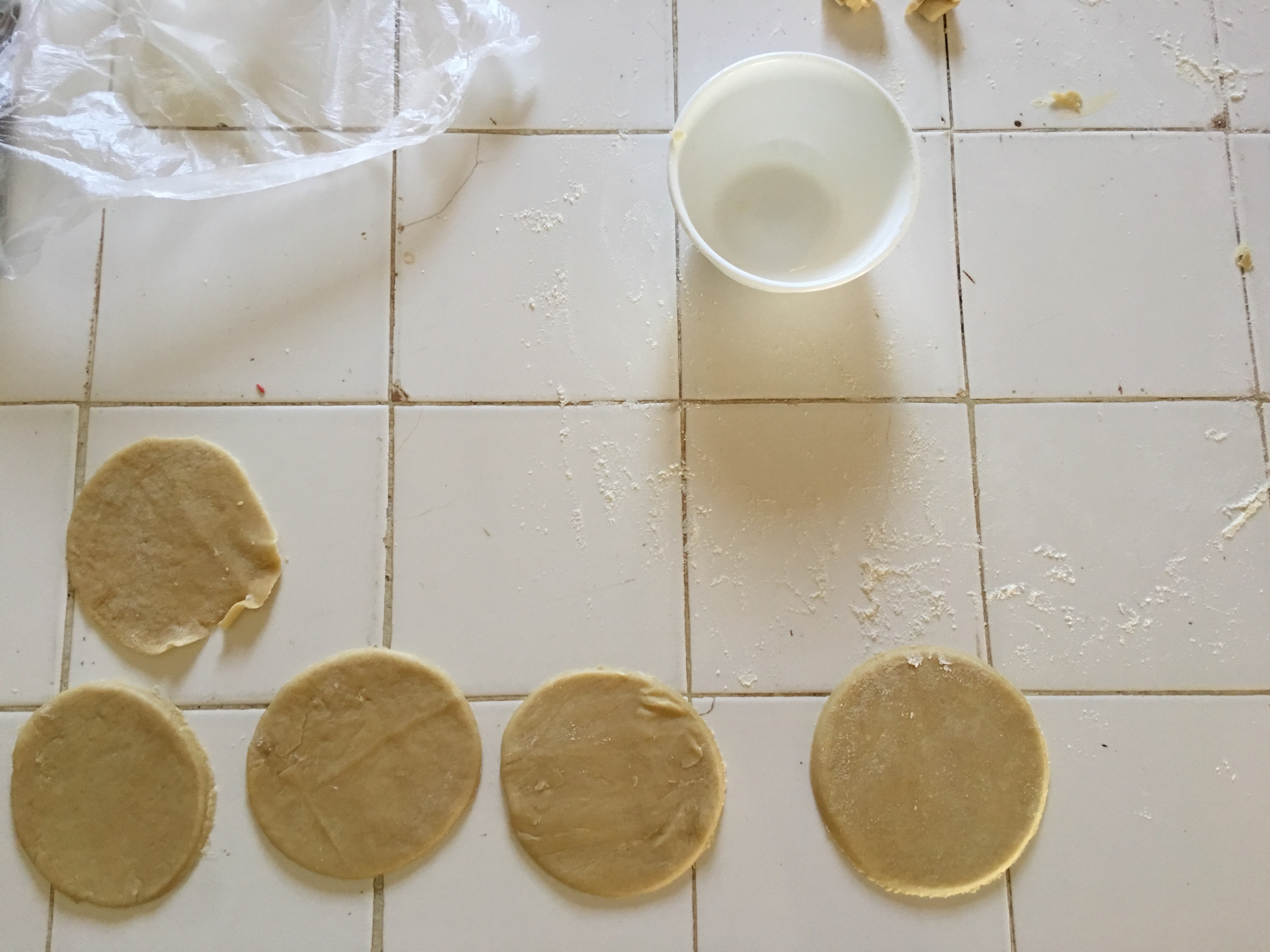 The dough came out, and it was time to make the pie crust. I should’ve used bigger circles, but again, I’m a stubborn cook, so I did not. I ended up flipping a small bowl and using it as my cutout for the circles. Use what ya got to get where ya goin’! Don’t forget to add flour to your roller or the dough will, in fact, stick…Disregard my last cutout. I was running out of dough, but “Ohana means family and family means no one gets left behind, or forgotten” -Stitch.