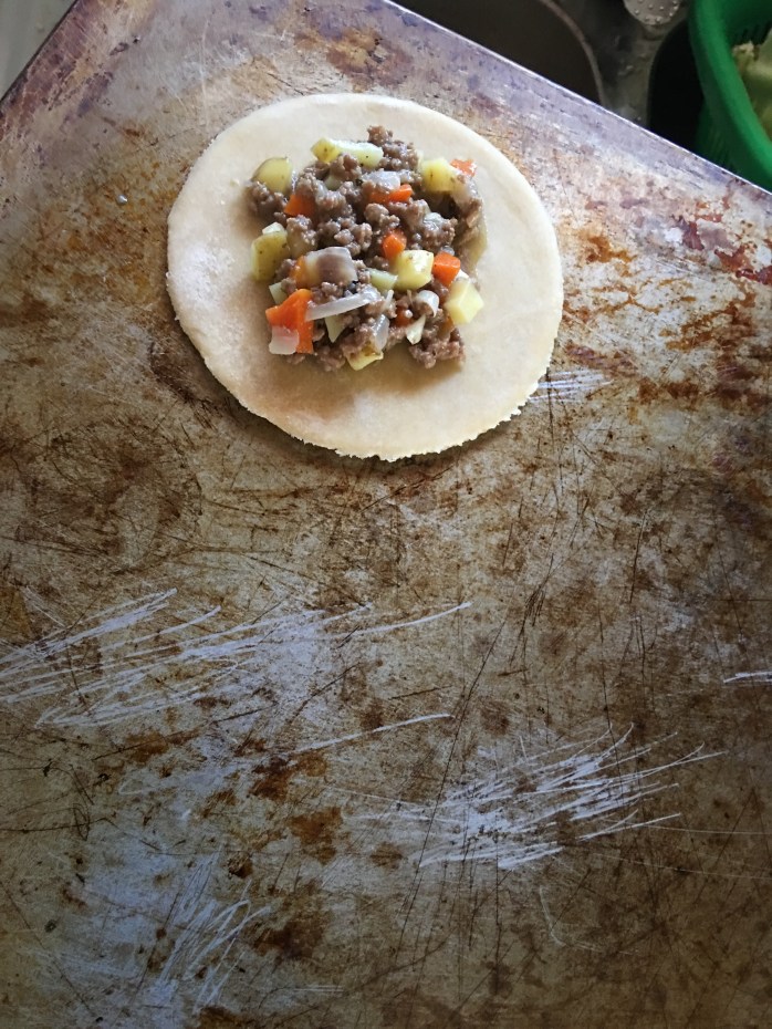 I went ahead and grilled the onions, garlic, and bell pepper before adding the ground meat and potatoes. I seasoned it with onion powder, black pepper, salt, CAYENNE, curry powder, and thyme. Once the meat was browned the potatoes still had a ways to go. Add 1 cup of water and about 1/4 cup of flour to create a chowder- like consistency. I’m sure you could dump it all in there, but I gradually added the flour to avoid clumping. I let that cook down while I prepared the dough.