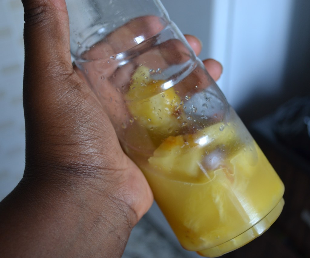 Grab how ever much pineapple you want. I think I used about 1/4 of a small one. The purpose of the pineapple is natural sweetness, so if you want to balance out the kick of the ginger, I’d say add 1/2 fresh one or one whole can of chopped. Mix that with a lil’ bit of honey and some of the pineapple juice.